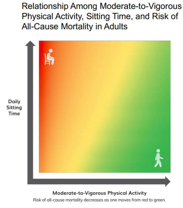 Here is a figure depicting the relationship between physical activity, sitting time, and risk of death from any cause.