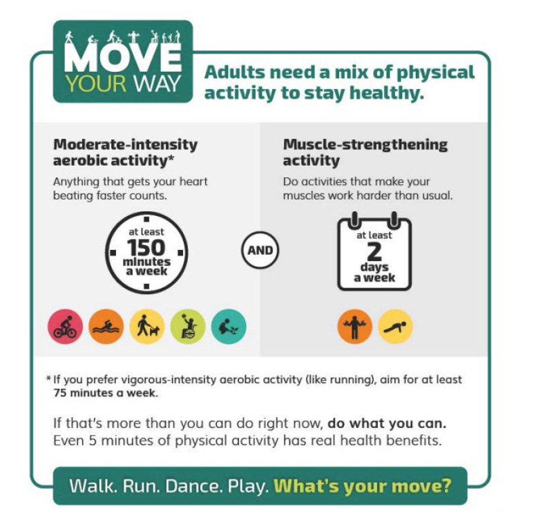 Here is an infographic from the CDC campaign, Move Your Way, to promote physical activity.